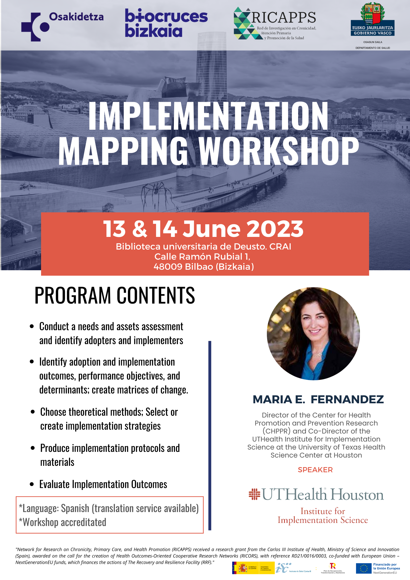 Además, como parte de la conferencia, se incluye un taller “Implementation Mapping Workshop” (13 – 14 junio) impartido por la experta María E. Fernández.