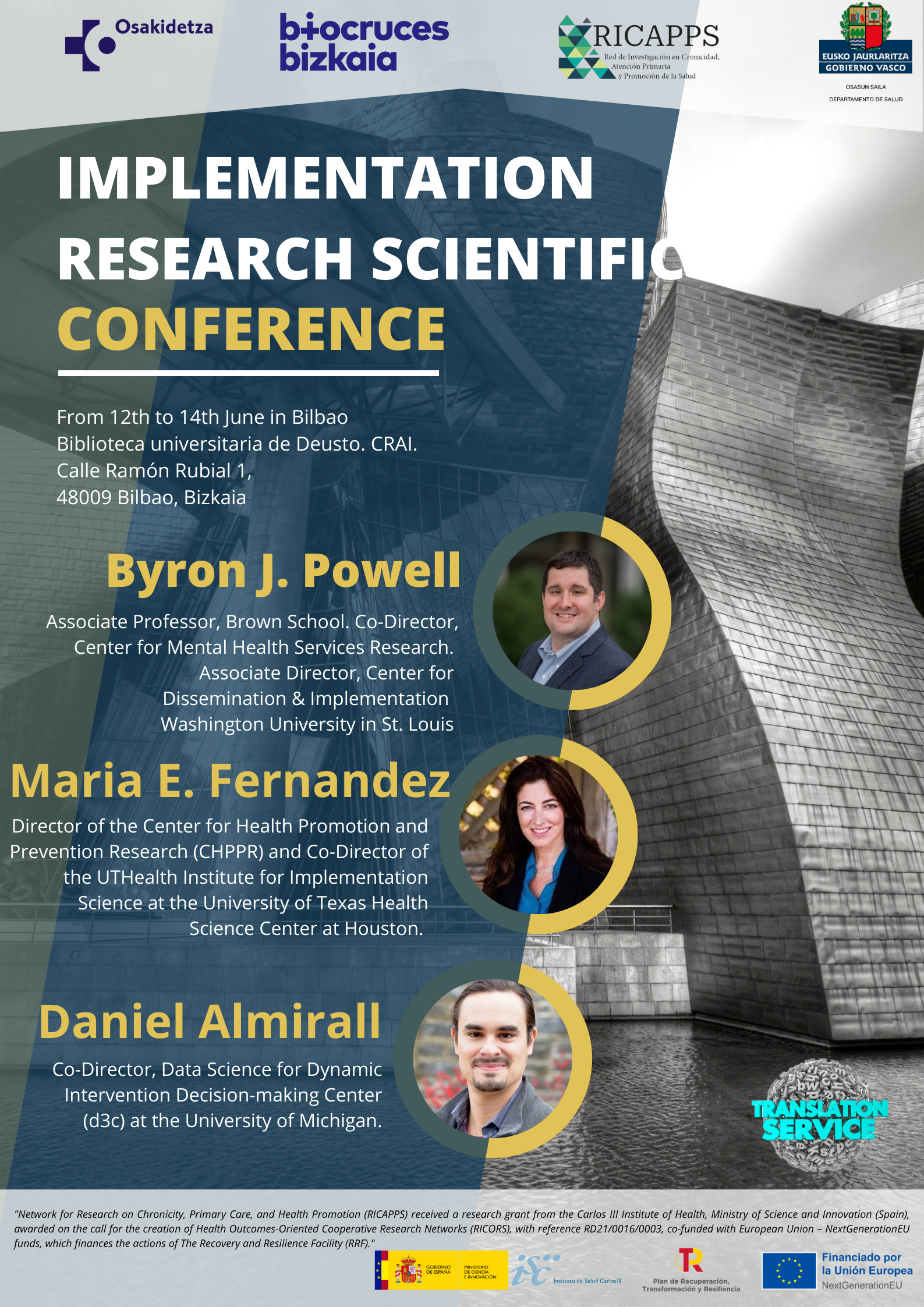 El grupo liderado por el Dr. Álvaro Sánchez Pérez, en Investigación en ciencias de la diseminación e implementación en servicios de salud junto al Departamento de Salud del Gobierno Vasco, Osakidetza y la RICAPPS - Red de Investigación en Cronicidad, Atención Primaria y Prevención y Promoción de la Salud organiza la conferencia internacional “Implementation Research Scientific Conference”, en Bilbao los días 12-14 de junio de 2023.